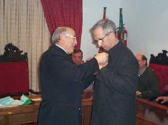 L'alcalde fent entrega a Mossèn Joaquín d'un pin de l'escut de Catí |